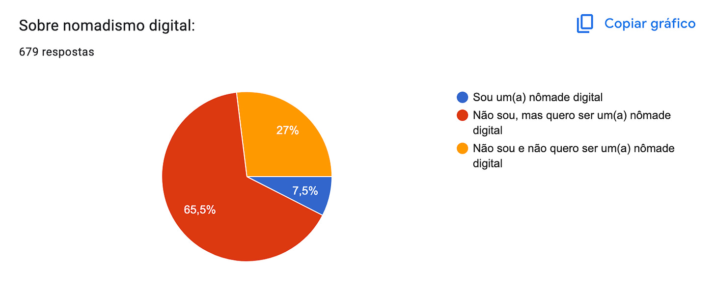 65,5% das pessoas responderam que não eram nômades, mas gostariam de ser; foquei nessa porcentagem e não dei bola para a pergunta mais importante do questionário: